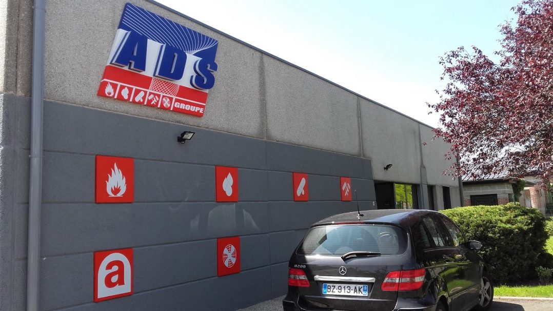 Lettres en blocs Leds lumineuses sur fond de tôle tablette avec des plaques de signalétiques représentant des pictos des métiers du client.